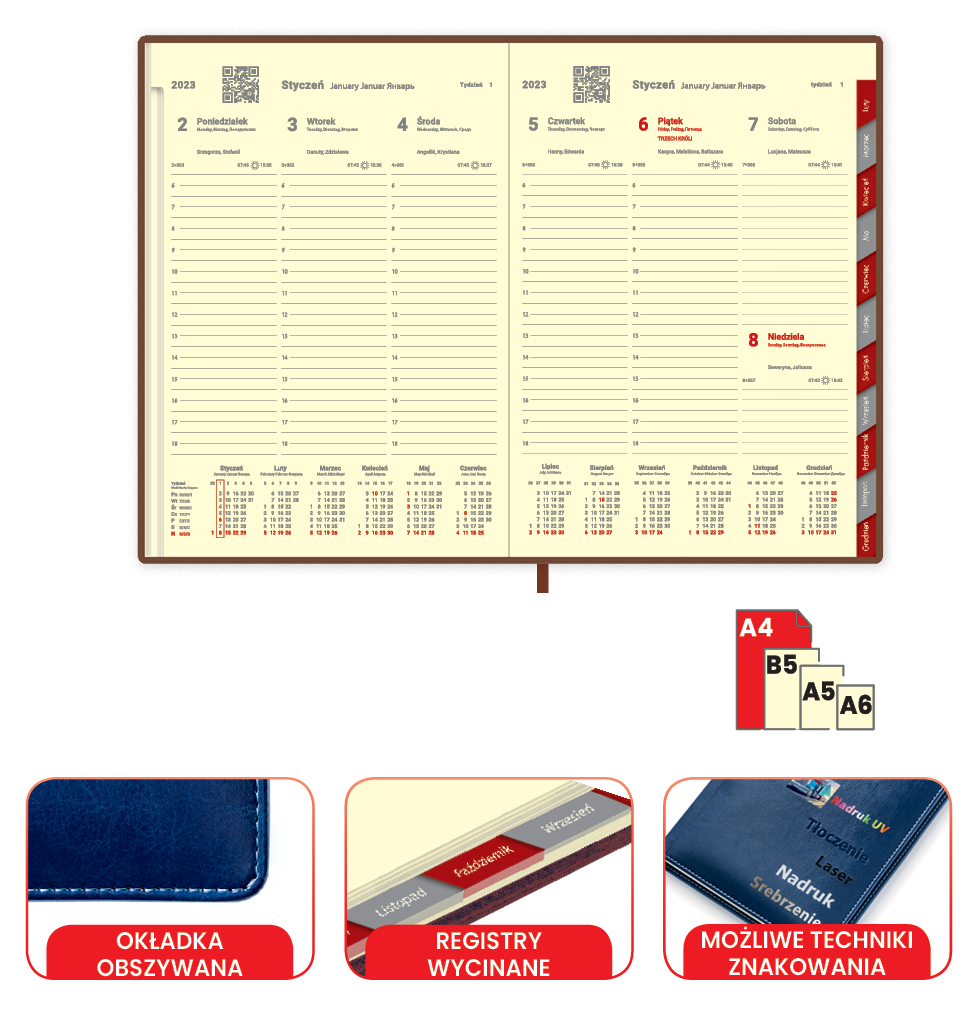 Oferujemy trwały NADRUK DTF w pełnym kolorze! Dostępne znakowanie na całej powierzchni oprawy kalendarza - wyceniane indywidualnie!